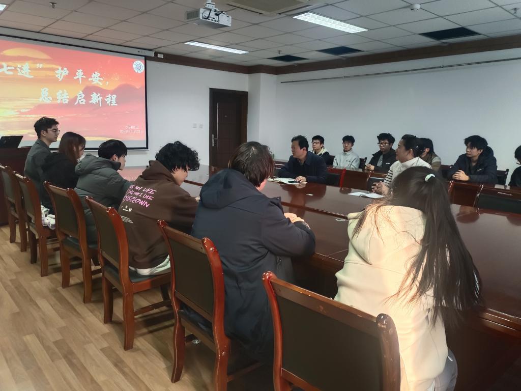 2025年11月21日,环境学院给排水科学与工程2401茅班“七进护平安,总结启新程”主题班会在尚德楼1522会议室举行。学院党委书记王海涌、班主任张云霞与班级全体同学一起通过总结过往、聚焦安全、明确方向,为大二学年的稳步推进筑牢基础。