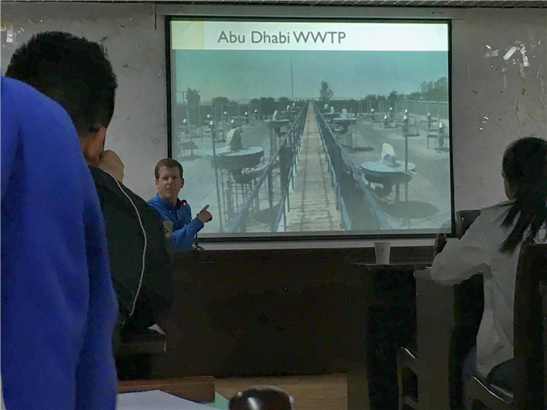 Timothy G Ellis教授作为美国依阿华州立大学的专家,主要从事生物呼吸评估和生物降解模拟,农业、工业和市政垃圾的厌氧处理,以及静态颗粒床反应堆的研究。已发表论文30多篇,在国家和国际会议上进行技术类演讲60多场。出版物在科学文献中被引用超300次, 在水环境研究期刊被引用最多的作者中排第16位。此次Timothy G Ellis教授的报告紧密结合各种水环境处理展开。首先介绍了升流式厌氧污泥床反应器,包括反应器的特性、起源地、作用、原理以及该系统的关键部件;之后对升流式厌氧污泥反应器适宜和不宜处理和应用的水环境进行了对比讲解;最后,Timothy G Ellis教授介绍了低污泥负荷废水的相关处理技术,因此引出了相关的静态颗粒床反应器,并向同学们详细讲解了此种反应器。此次报告内容丰富、深刻,赢得了在场师生的一致赞誉,师生们觉得受益匪浅。