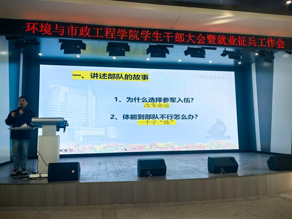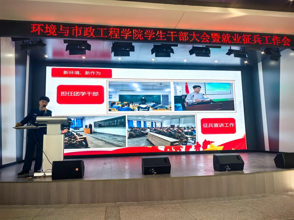 为扎实推进2025年春季征兵工作,12月19日下午,环境与市政工程学院在五教萃英厅召开大学生应征入伍动员宣讲会。学院党委书记王海涌,学工办全体辅导员、各年级班委委员以及未签约的2025届毕业生,共计350余人参加了活动。