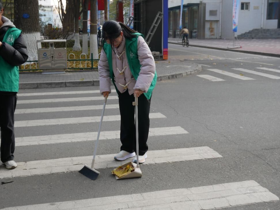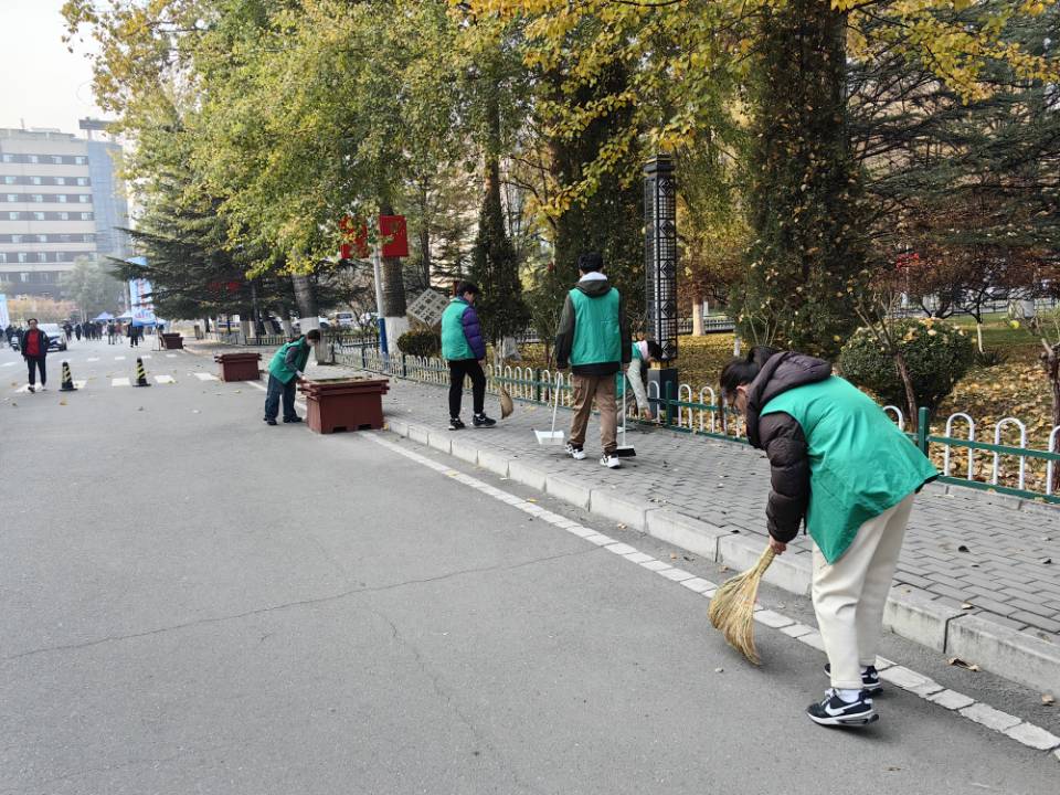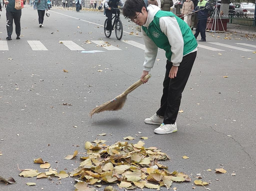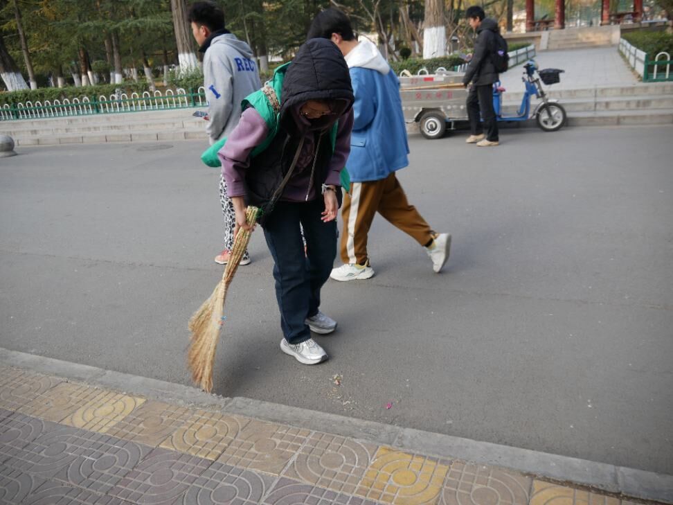 活动当天,志愿者们身着统一的服装,被有序地分成多个小组,分别在上午和下午两个时段进行清扫工作。在鸽子广场前,工作人员早早地准备好了签到表和清扫工具,并高效地进行了签到和物资分发。根据清扫区域的具体情况,工作人员将任务详细分配给了每位志愿者,确保清扫工作能够有序进行。尽管寒风刺骨,但志愿者们的热情却丝毫未减。他们手持清扫工具,迅速奔赴各自的指定地点。在清扫过程中,大家分工明确,协作紧密。有的志愿者负责将落叶归拢成堆,有的则负责将其装入簸箕并倒入附近的垃圾箱。经过大家的共同努力,校园环境焕然一新,道路恢复了往日的整洁与美观。