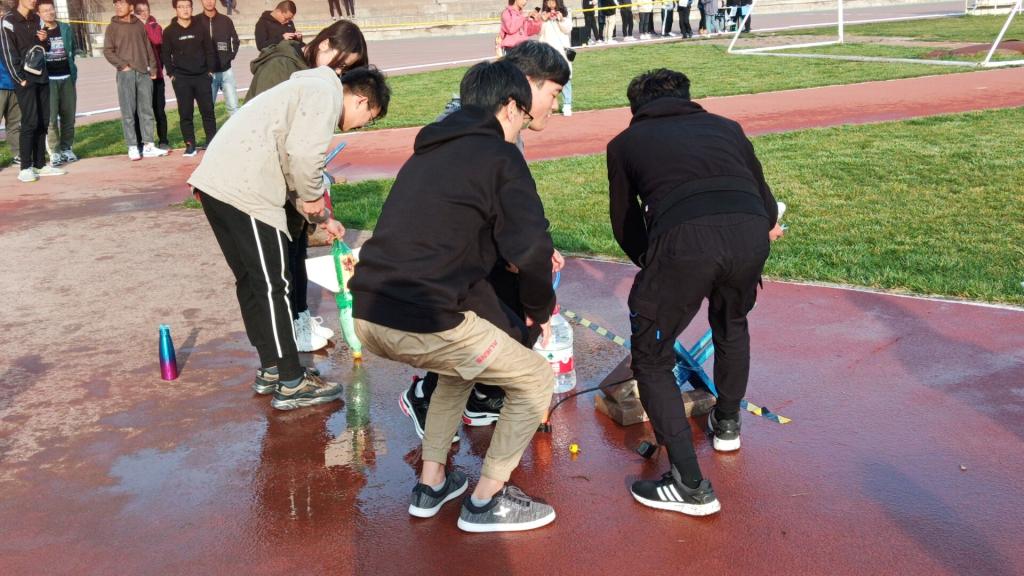 本次活动共有108组选手积极报名参加。活动一开始,各组参赛选手严阵以待、信心满满。首先,参赛选手们向制作好的水火箭注入水,将水量与火箭空间容量的比例控制在试验多次测得的比例范围中;随后,组员们拧紧瓶盖将水火箭装入发射架上;接着,对水火箭进行打气,观察火箭是否有漏气情况;最后,调整发射角度,火箭腾空!搭载着我们的心与梦想的水火箭一飞冲天,飞向远方,满载星辉。各组选手接连的精彩表演赢得了观众们的阵阵喝彩,此次水火箭比赛在欢呼声中完美落下帷幕。