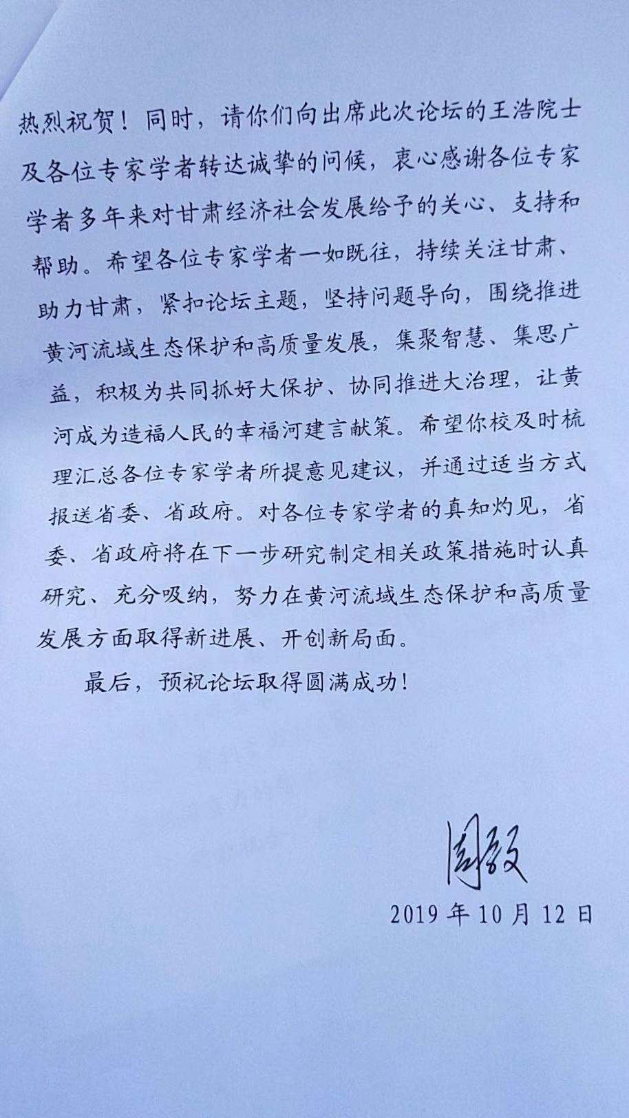 仪式中宣读了甘肃省人民政府周学文副省长对此次论坛的批复精神。周省长指出:“本次学术论坛既是深入学习贯彻习近平生态文明思想,落实习近平总书记视察甘肃重要讲话和指示精神的具体举措,更充分体现了你校高度的政治站位和务实的工作作风,彰显了建设高水平智囊团和思想库、主动服务地方经济社会发展的责任担当和深厚的富民兴陇情怀,具有很强的政治意义、现实意义和理论意义”。周省长还对参加此次论坛的与会专家转达了诚挚的问候,也希望专家们为共同抓好黄河的大保护、大治理积极献言献策,让黄河成为造福人民的幸福河。