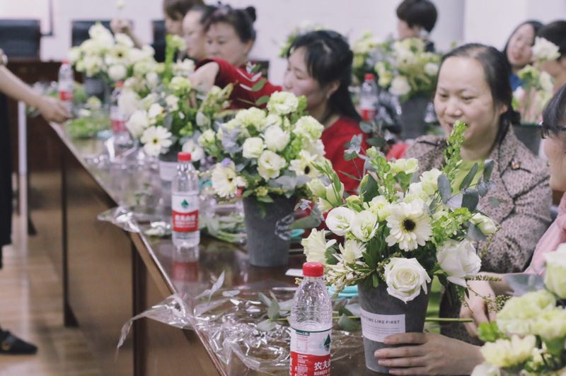整个活动最精彩、最令人期待的环节是由女同胞们DIY一盆属于自己的花束,一支支白玫瑰、康乃馨、洋菊梗、非洲菊……,经过女同胞们的巧手修枝剪叶,细致地置入花器。当一盆盆错落有致、造型各异的插花作品展现在大家面前时,惊喜之情溢于言表,寄托着大家对美的理解和对幸福的感悟。