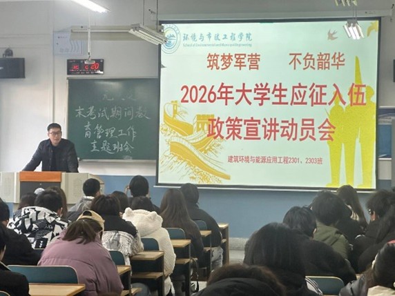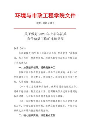 做好大学生征兵宣传工作,既是服务国防和军队现代化建设的基础工程,也是拓宽青年学生成长成才通道的有效举措。对此,学院党委有着清醒的认识和高度的自觉,在认真总结去年成功经验做法的基础上,“一班人”坚持及早筹划、及早布局,把工作想在前、干在先,从进入十二月份起,就先后3次召开领导小组会议,全面分析学院生源情况,提前摸排预征对象,有针对性地提出了管理细致、服务细心、政策细化的“三细”工作思路。学校征兵宣传工作正式启动后,更是在第一时间制定了《环境与市政工程学院关于做好2026年上半年征兵宣传动员工作的实施意见》(院发〔2025〕34号),进一步细化明确了征兵宣传的任务分工、工作进度和完成目标,要求各系(办)必须将征兵宣传纳入重点工作清单,由学工办具体牵头,国防教育辅导员专人负责,各系(办)和班级层层抓落实,确保做到“两个到位”,即:工作落实到位、责任落实到位,为宣传动员工作的高效开展奠定了坚实的组织基础。