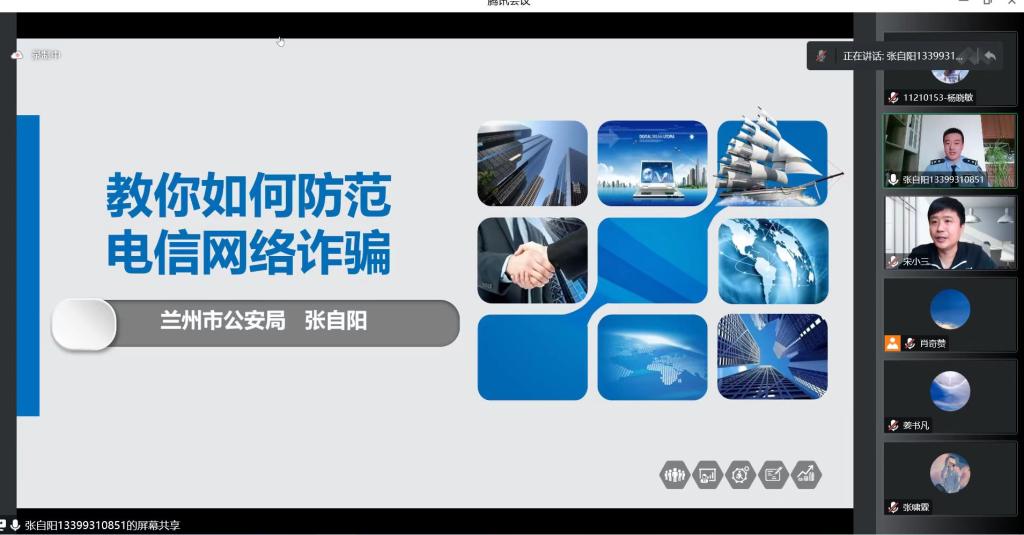 学院以班级为单位组织线上防诈骗主题班会,通过案件示例、警示教育等多种方式加强学生电信网络安全认知水平,同时落实学生下载安装“国家反诈中心”APP、“终结诈骗”(金钟罩)小程序等防诈软件防范未然,组织学生宣读《防电诈承诺》,提升学生防诈意识。