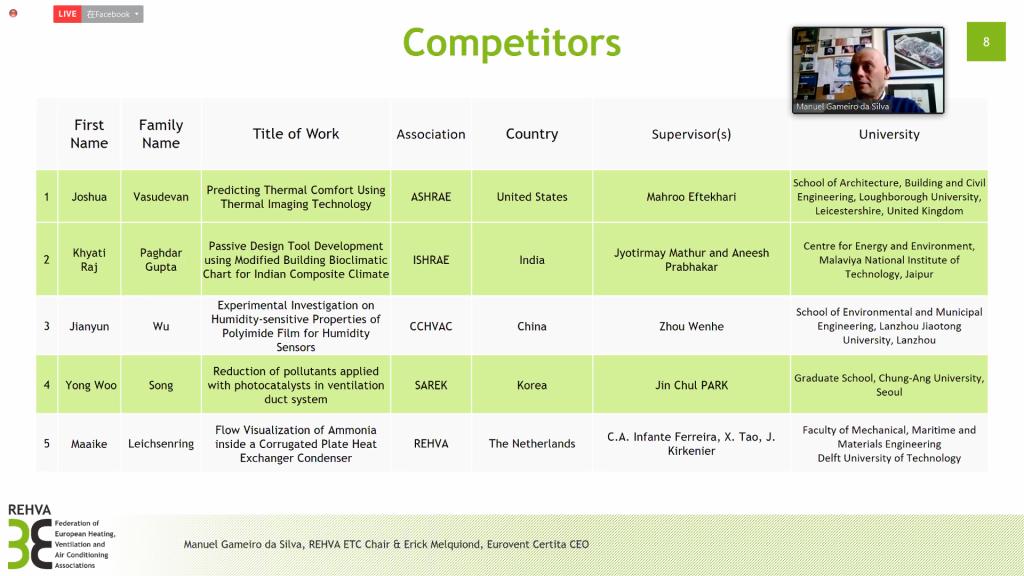 第四届世界暖通空调学生科技竞赛于北京时间2021年5月27日晚上8:00在线上举行,由中国暖通空调学会、欧洲暖通空调学会、美国暖通空调学会、印度暖通空调学会、韩国暖通空调学会分别推荐的五位2019年各赛区第一名参加了比赛。