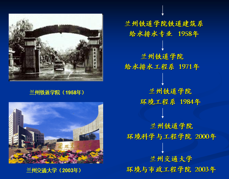 1958年唐山铁道学院铁道系给排水专门化成建制迁至甘肃兰州组建为兰州铁道学院铁道建筑系给水排水专业;